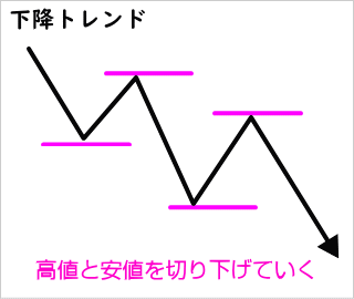 下降トレンドでも同じで高値と安値を切り下げているのが続いている場合はトレンド相場と判断します。
