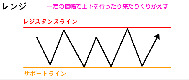 レンジとは「範囲」という意味で、上限と下限が決まっている相場の状態です。