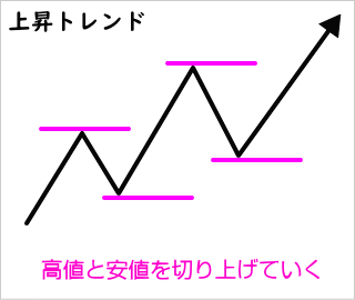 たとえば上昇トレンドが出てる状態だと、図のように高値と安値を切り上げていきます。これが続いている場合は、トレンド相場と判断します。