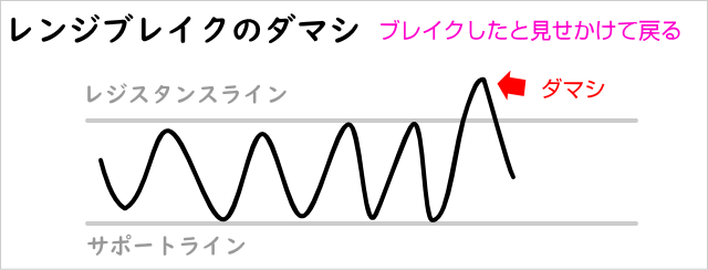 サポートラインやレジスタンスラインを突破し、レンジブレイクしたのでは?と思っても、それが本物ではなく、価格が戻ってくる場合があるからです。
