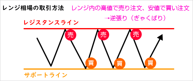 トレンド相場なら「上がったら買う」「下がったら売る」という順張りが妥当なのですが、レンジ相場になったらレンジ幅の