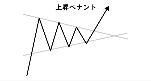 上昇ペナントと下降ペナントの2種類が存在し、レートが大幅に上昇した場合には、上に抜けやすく、その逆で下落した場合はそのあと下に抜けやすくなります。